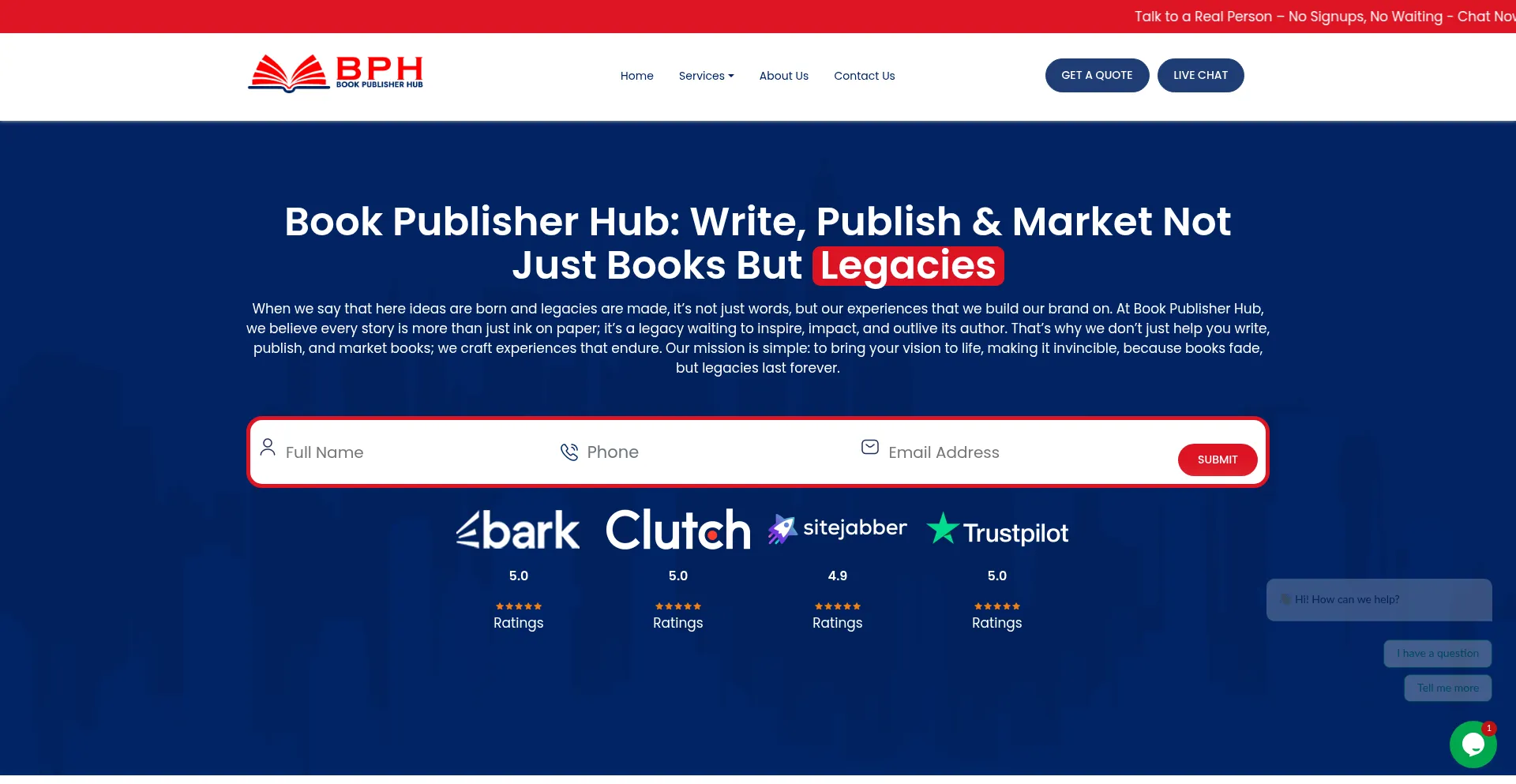The bookpublisherhub.com website implements data collection forms requesting personal information including names, email addresses, phone numbers, or other sensitive details. Users should verify the legitimacy of it and review privacy policies before submitting personal data.