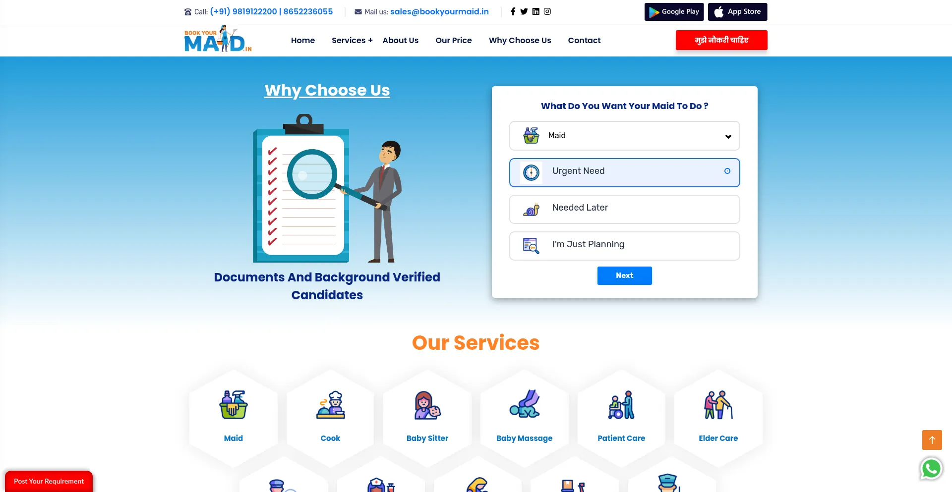 The bookyourmaid.in website offers a mobile application for Android devices, indicating expanded platform presence beyond web-based services.