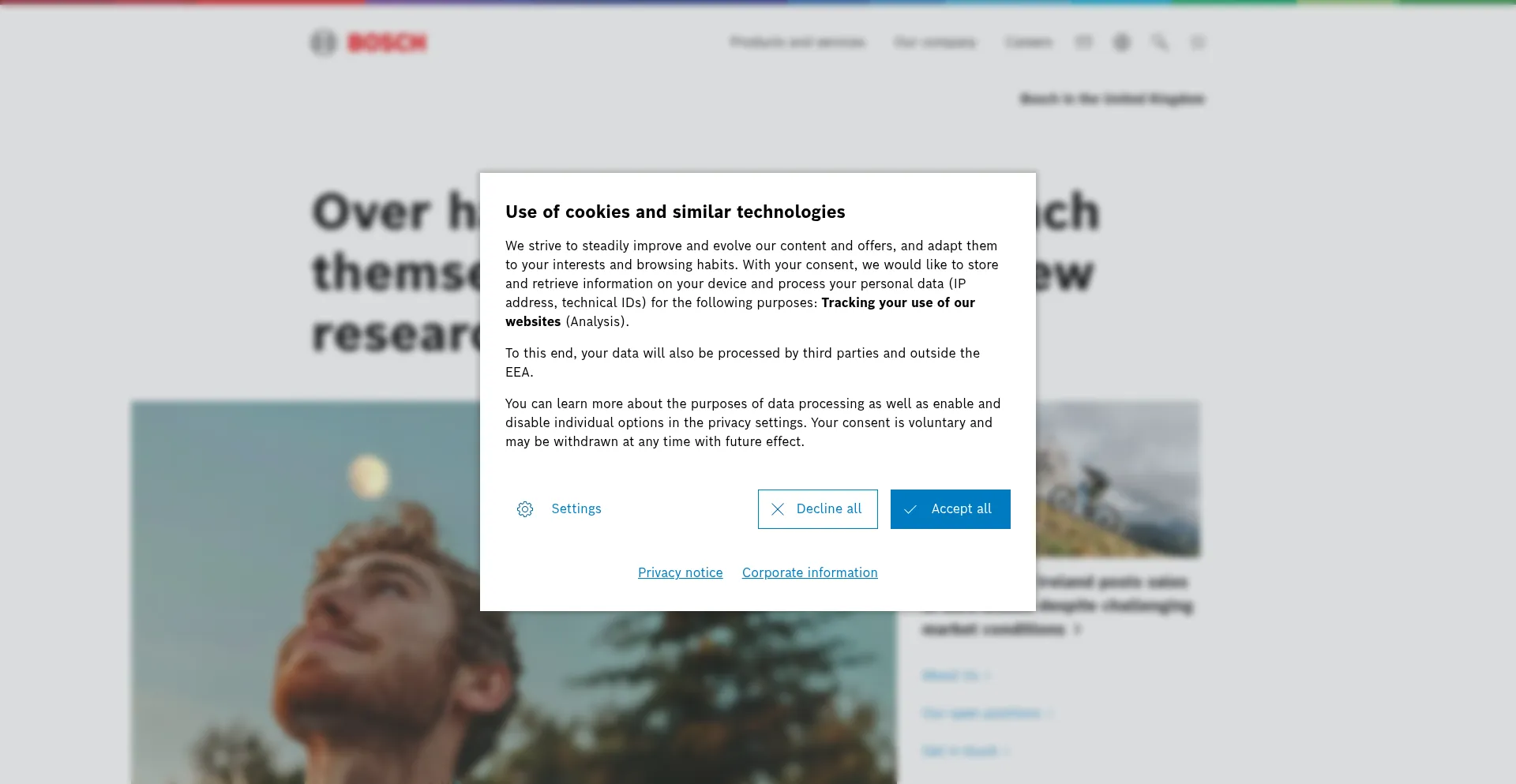The website implements cookie consent mechanisms in compliance with privacy regulations such as GDPR or CCPA. This demonstrates that bosch.co.uk adheres to data protection standards and provides users with control over personal data collection practices.