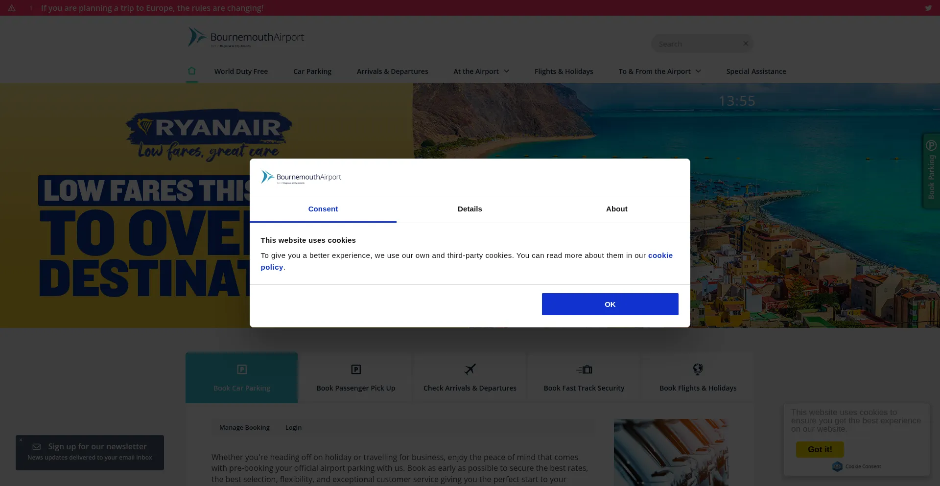 The website implements cookie consent mechanisms in compliance with privacy regulations such as GDPR or CCPA. This demonstrates that bournemouthairport.com adheres to data protection standards and provides users with control over personal data collection practices.