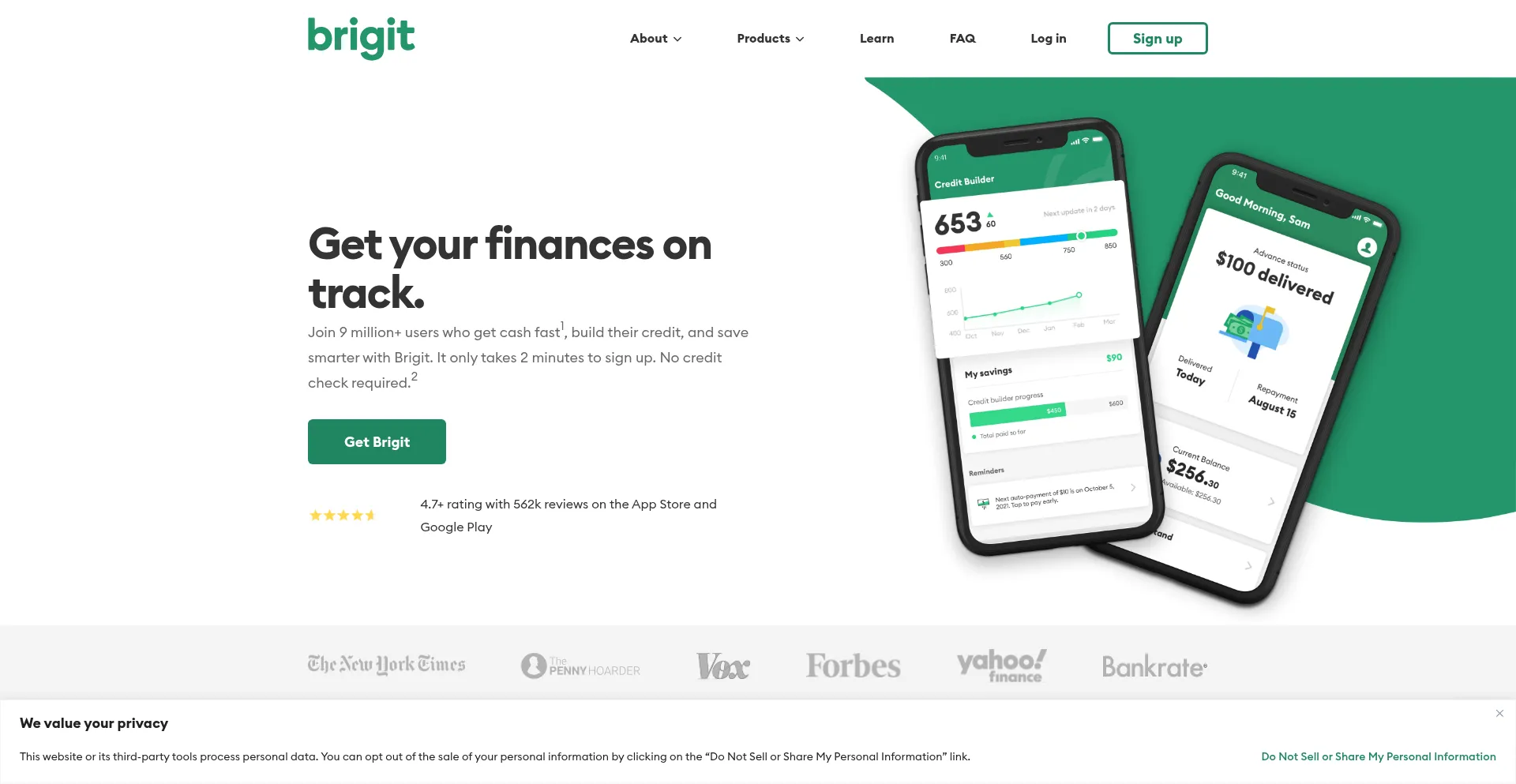 Get cash fast. Build credit while saving. No credit check, no late fees, no tipping. Join over 9 million Brigit app users.