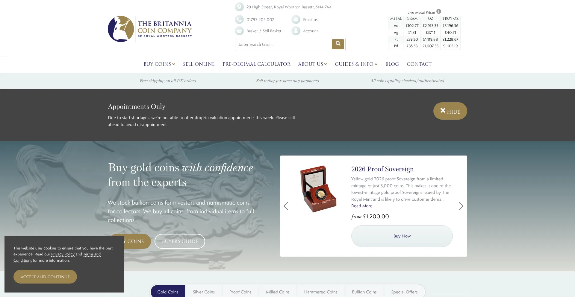 Leading coin dealer, just outside Swindon in Wiltshire. Buy & sell gold Sovereigns, Britannias & collectable coins. BNTA member. Free UK shipping.