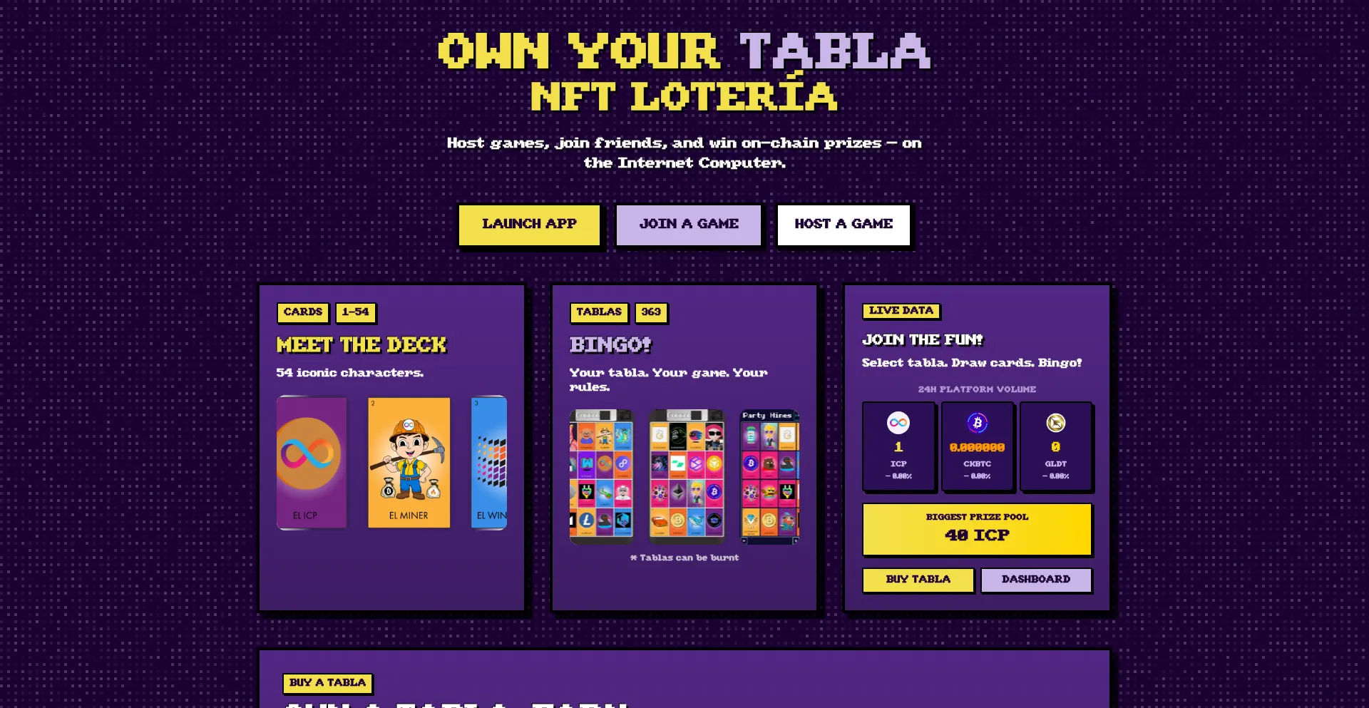 Play authentic Mexican Lotería with NFT cards on the Internet Computer blockchain. Rent tablas, compete for prizes in ICP, ckBTC & GLDT. Join the decentralized gaming revolutio...