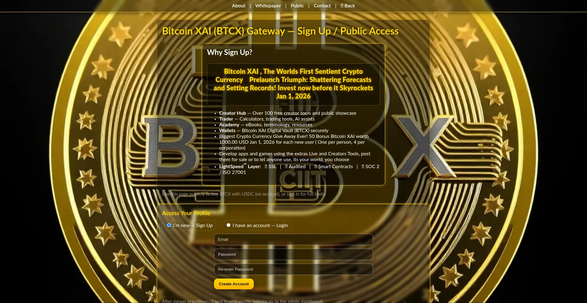Bitcoin XAI (BTCX) Gateway — Buy BTCX with USDC (MetaMask & Phantom) | Sign Up / Public Landing