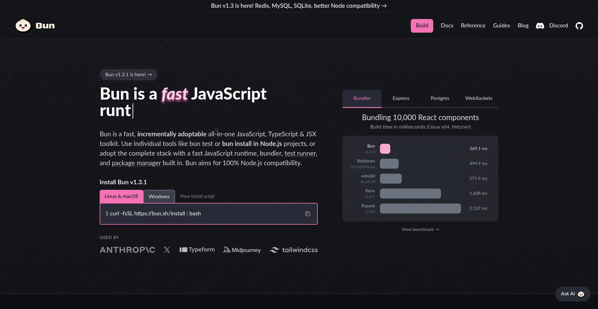 Bundle, install, and run JavaScript & TypeScript — all in Bun. Bun is a new JavaScript runtime with a native bundler, transpiler, task runner, and npm client built-in.