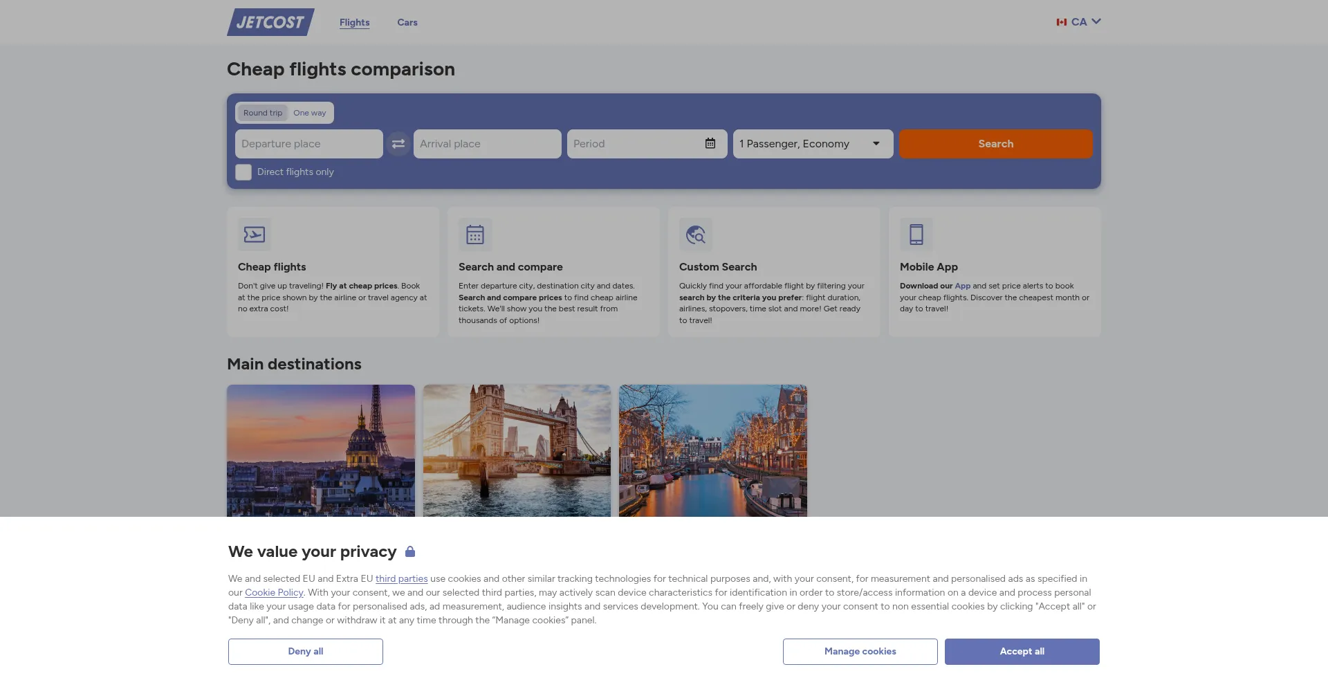 The website implements cookie consent mechanisms in compliance with privacy regulations such as GDPR or CCPA. This demonstrates that ca.jetcost.com adheres to data protection standards and provides users with control over personal data collection practices.