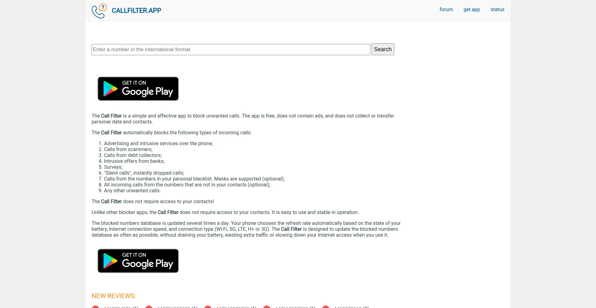 The callfilter.app website offers a mobile application for Android devices, indicating expanded platform presence beyond web-based services.