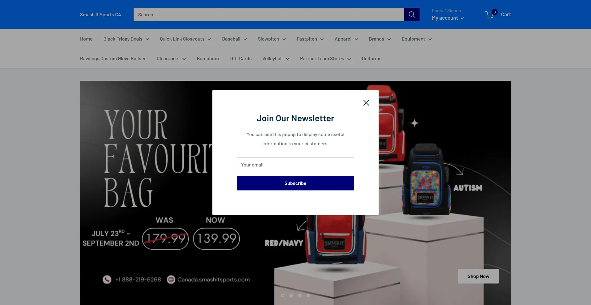 Analysis indicates that canada.smashitsports.com operates as an e-commerce platform facilitating online transactions for goods or services. The website implements shopping cart functionality, payment processing systems, and product catalog features typical of commercial retail operations.