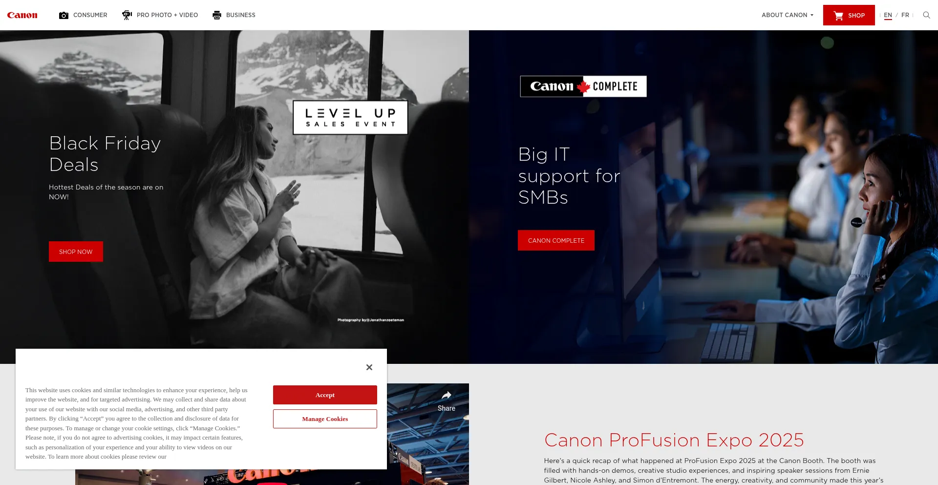 The website implements cookie consent mechanisms in compliance with privacy regulations such as GDPR or CCPA. This demonstrates that canon.ca adheres to data protection standards and provides users with control over personal data collection practices.