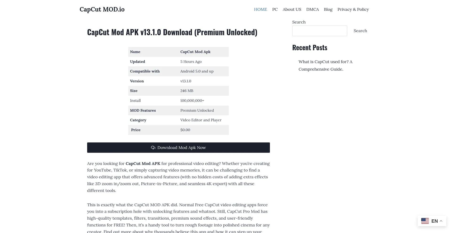 Capcutmod.io operates as a suspicious website with multiple red flags that compromise its trustworthiness and user safety. The platform exhibits concerning characteristics including misleading information, questionable operational practices, or potential malware distribution that poses significant risks to visitors.