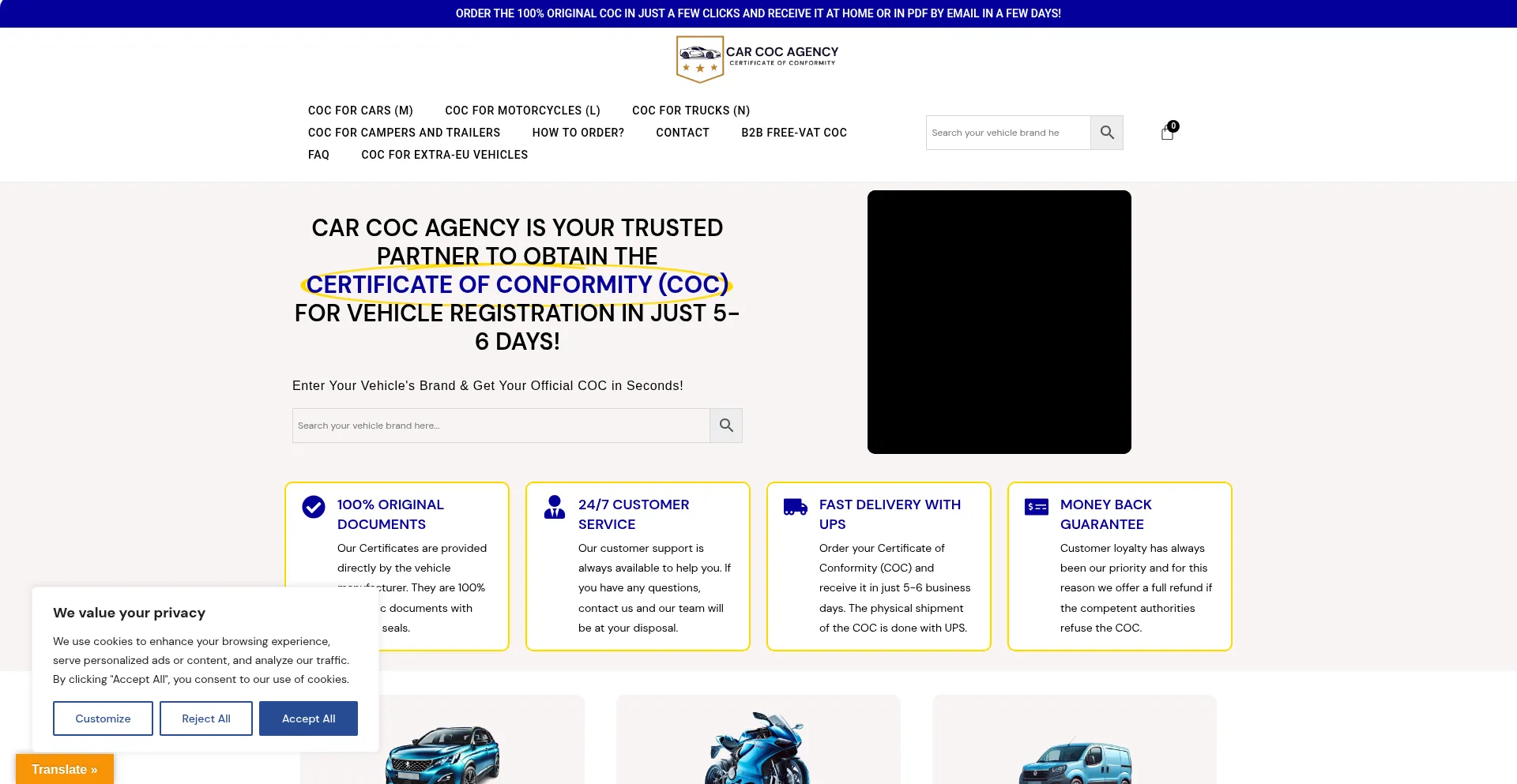 Official Original European Certificate of Conformity (COC) from 129 euros in 4 days. COC for Passenger Cars (M), COC for Motorcycles (L) and COC for Trucks (N).
