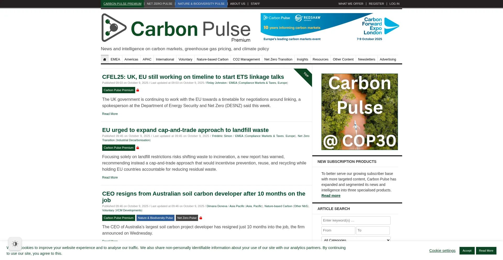 The website implements cookie consent mechanisms in compliance with privacy regulations such as GDPR or CCPA. This demonstrates that carbon-pulse.com adheres to data protection standards and provides users with control over personal data collection practices.