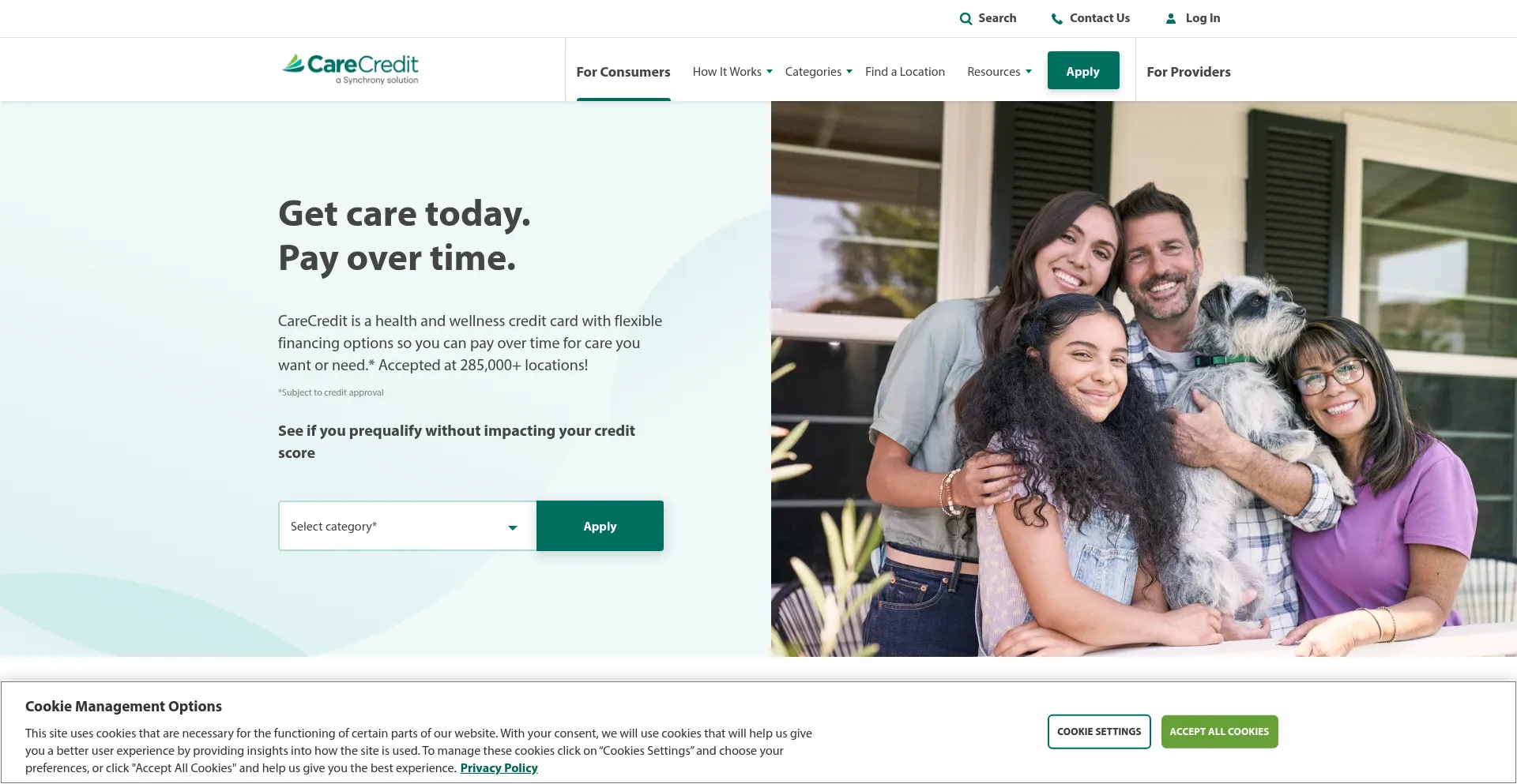 The website implements cookie consent mechanisms in compliance with privacy regulations such as GDPR or CCPA. This demonstrates that carecredit.com adheres to data protection standards and provides users with control over personal data collection practices.