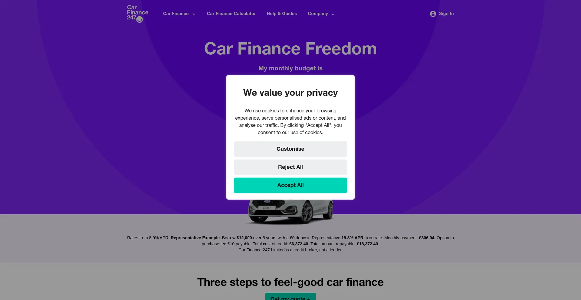 The website implements cookie consent mechanisms in compliance with privacy regulations such as GDPR or CCPA. This demonstrates that carfinance247.co.uk adheres to data protection standards and provides users with control over personal data collection practices.