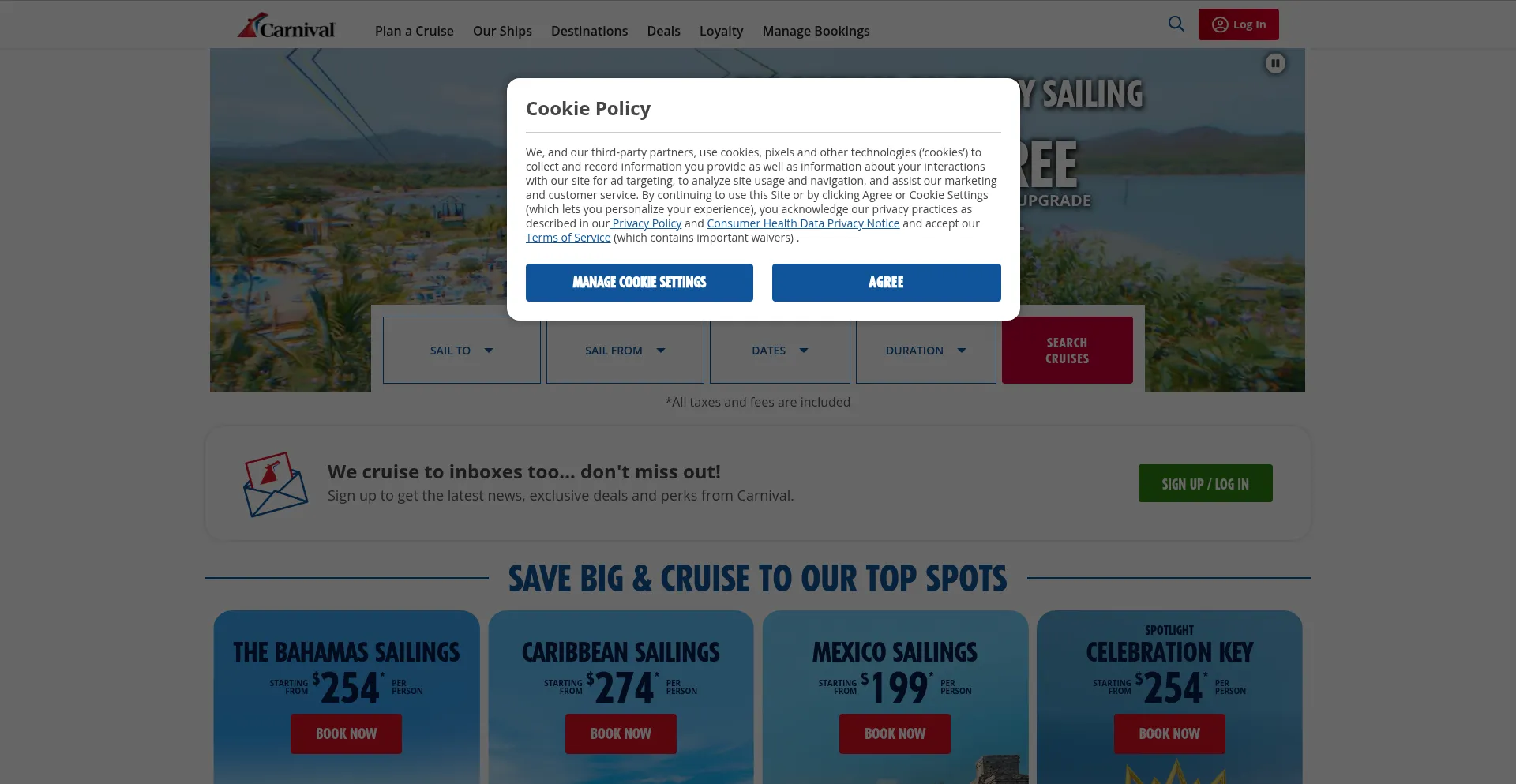 The website implements cookie consent mechanisms in compliance with privacy regulations such as GDPR or CCPA. This demonstrates that carnival.com adheres to data protection standards and provides users with control over personal data collection practices.