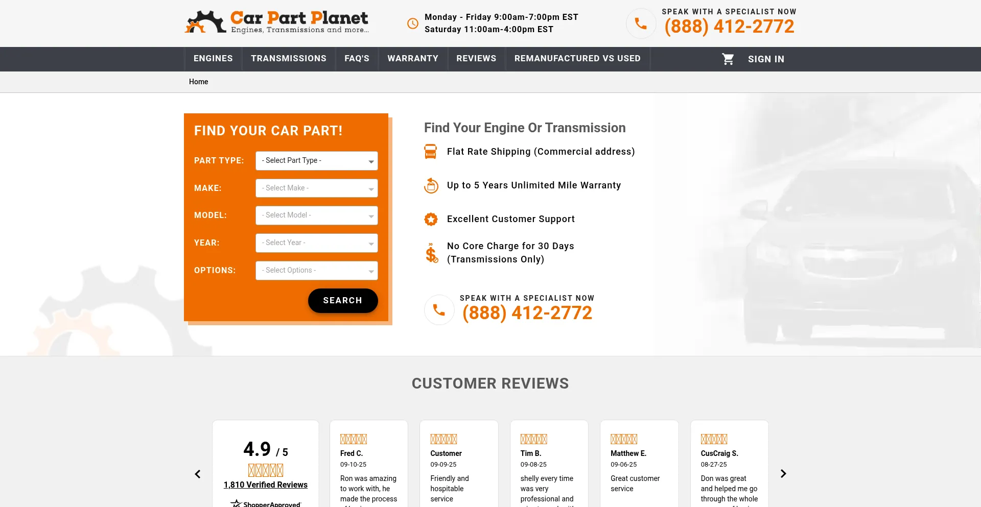 Used & Remanufactured Engines & Transmissions. Car Part Planet Offers Both Plus No Core Charge for 30 Days, Flat Rate Shipping (Commercial address) & Up to 5-Year Warranty.