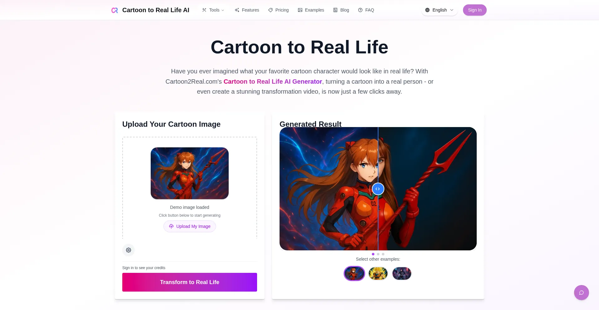 Cartoon to Real Life made easy! Turn your cartoon, anime, or avatar images into realistic faces online using AI. Quick results, no design skills required.