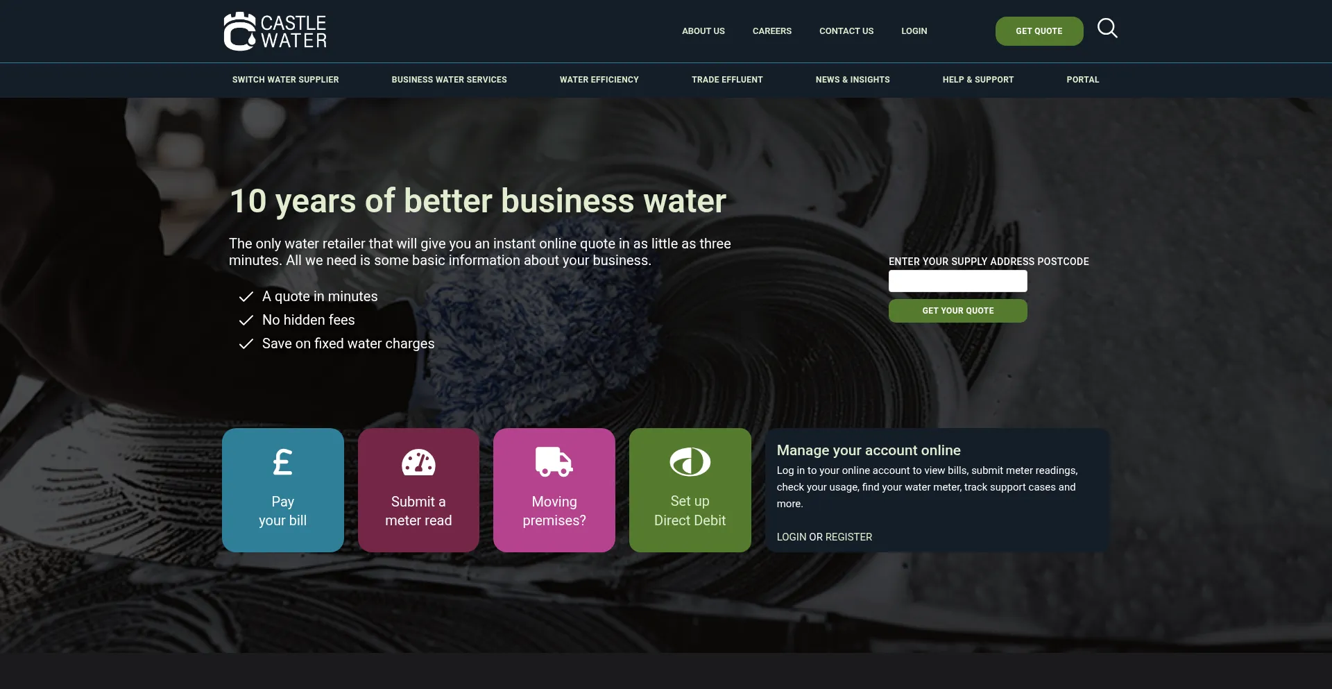 Castle Water supplies thousands of businesses, charities and public bodies in England and Scotland. Get a quick quote online and switch to us today.