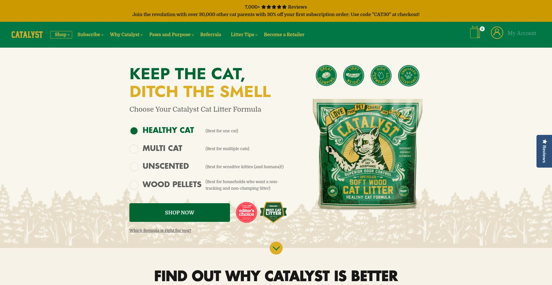 Catalyst is the world’s best lightweight, soft wood, low dust-free clumping cat litter that will give your cat the best while doing your best for the planet.