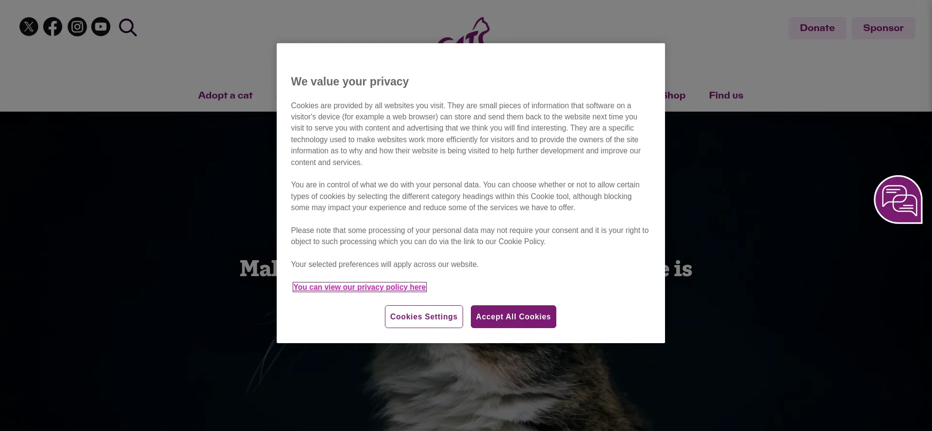 The website implements cookie consent mechanisms in compliance with privacy regulations such as GDPR or CCPA. This demonstrates that cats.org.uk adheres to data protection standards and provides users with control over personal data collection practices.