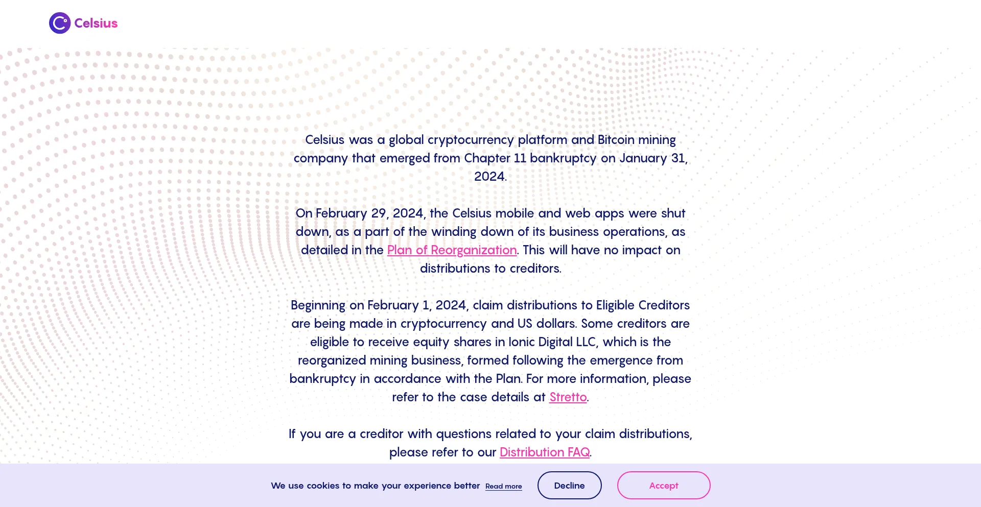 Celsius was a global cryptocurrency platform and Bitcoin mining company that emerged from Chapter 11 bankruptcy on January 31, 2024.On February 29, 2024, the Celsius mobile and ...