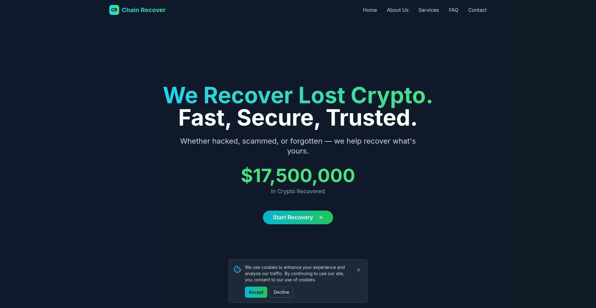 The website implements cookie consent mechanisms in compliance with privacy regulations such as GDPR or CCPA. This demonstrates that chain-recover.com adheres to data protection standards and provides users with control over personal data collection practices.