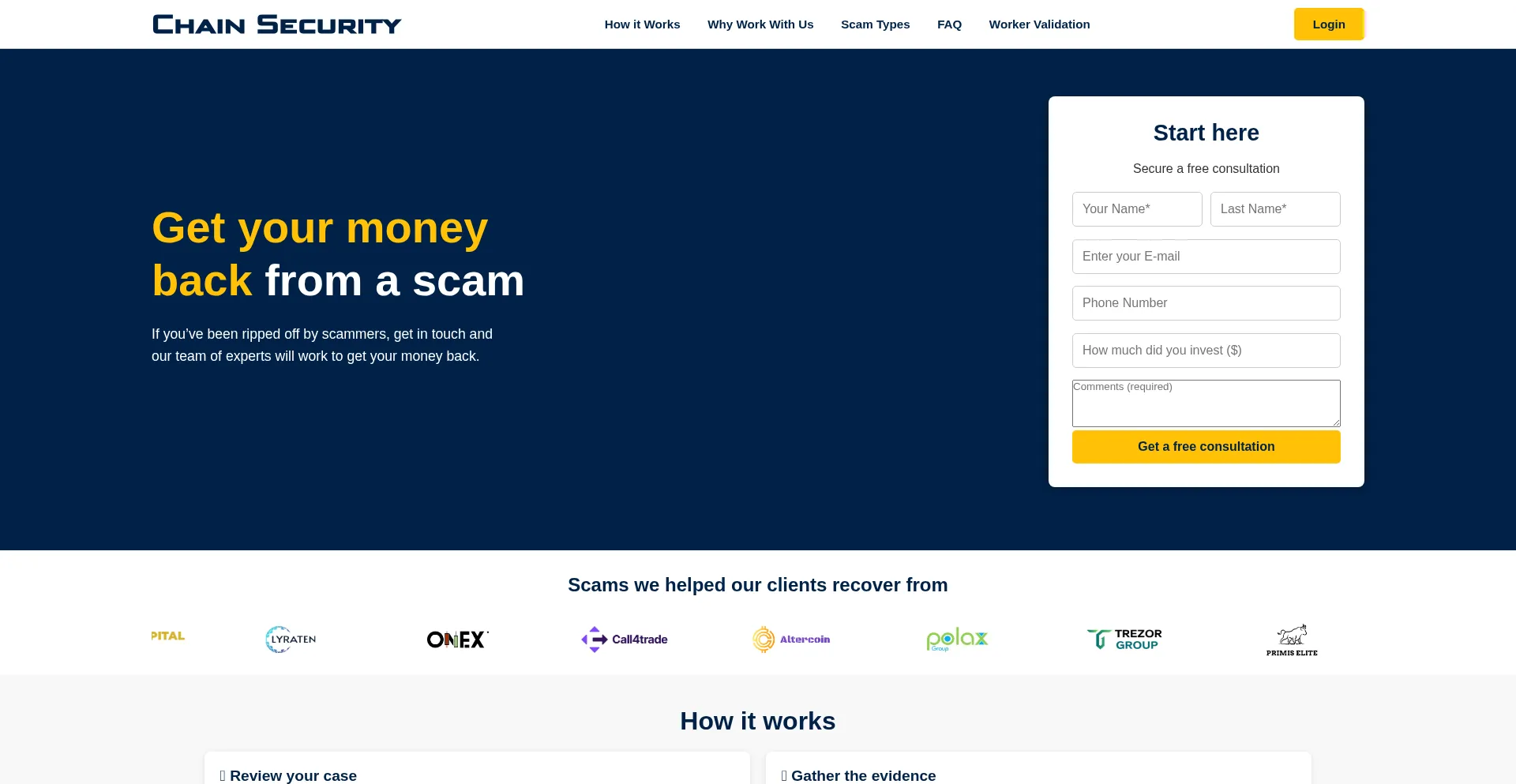 The website chain-security.org advertises fund recovery services for lost or stolen assets. While some operate on contingency fee structures, others may require upfront payments, which can indicate fraudulent operations. Verify credentials and regulatory compliance before engaging such services.