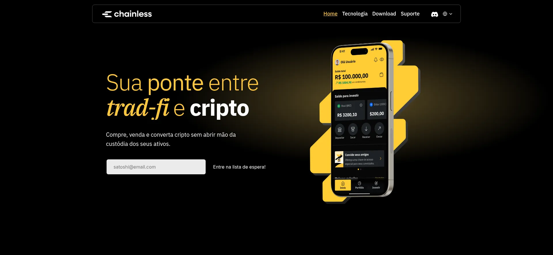 Chainless conecta você ao universo cripto com Pix e autocustódia. Invista com liberdade, segurança e controle total sobre seus ativos, de forma fácil e intuitiva.
