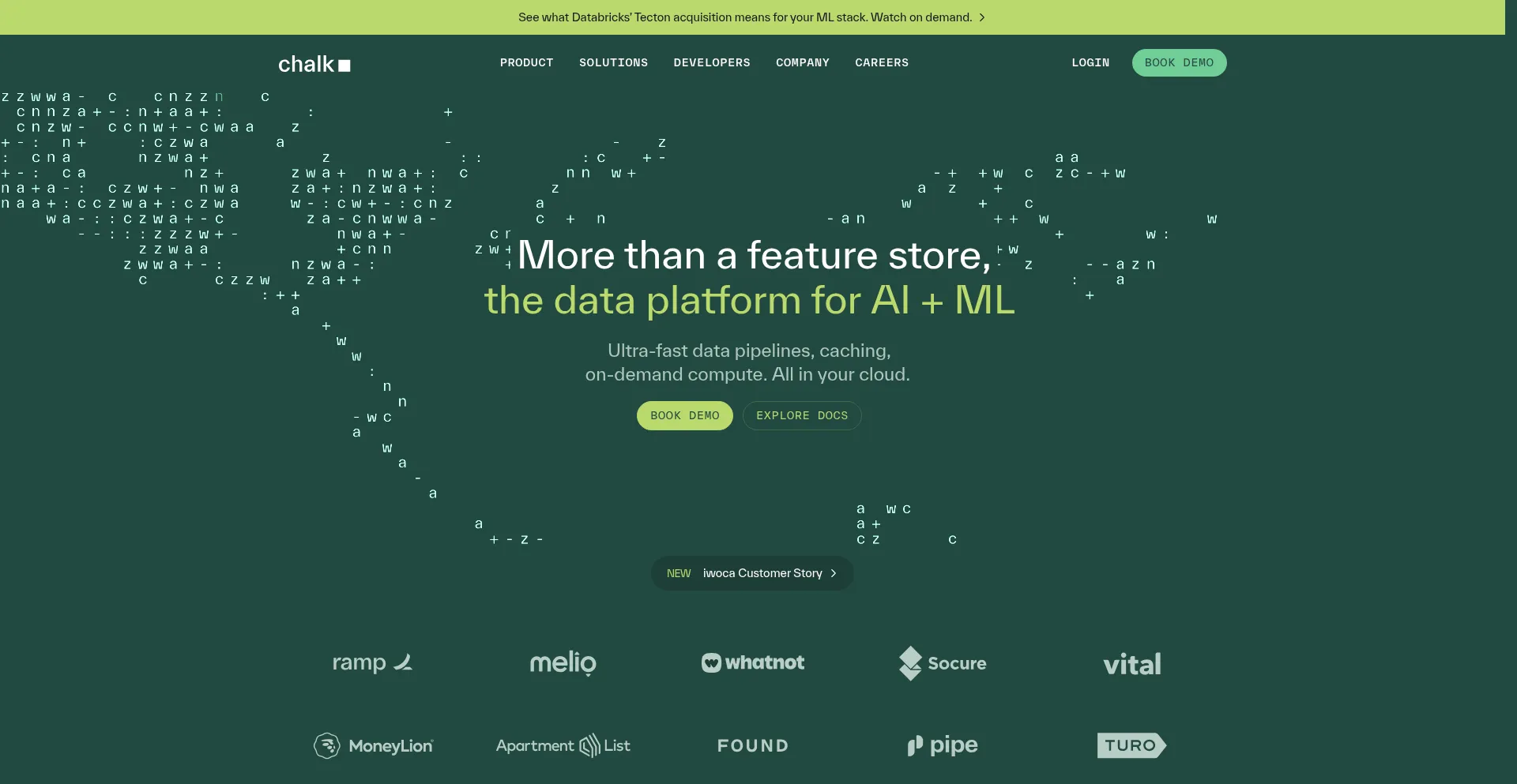 Chalk is the real-time data platform for ML & GenAI. More than a feature store, Chalk delivers fresh features in under 10ms with on-demand compute and caching in your cloud.