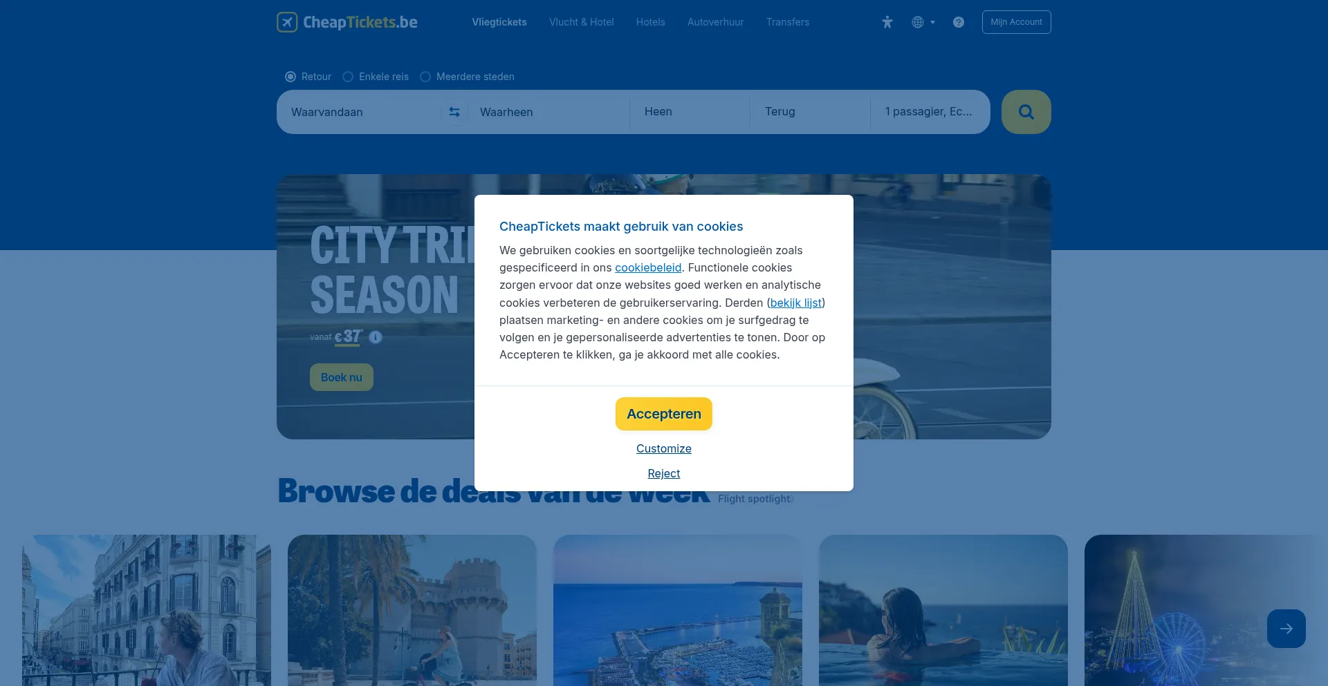 The website implements cookie consent mechanisms in compliance with privacy regulations such as GDPR or CCPA. This demonstrates that cheaptickets.be adheres to data protection standards and provides users with control over personal data collection practices.