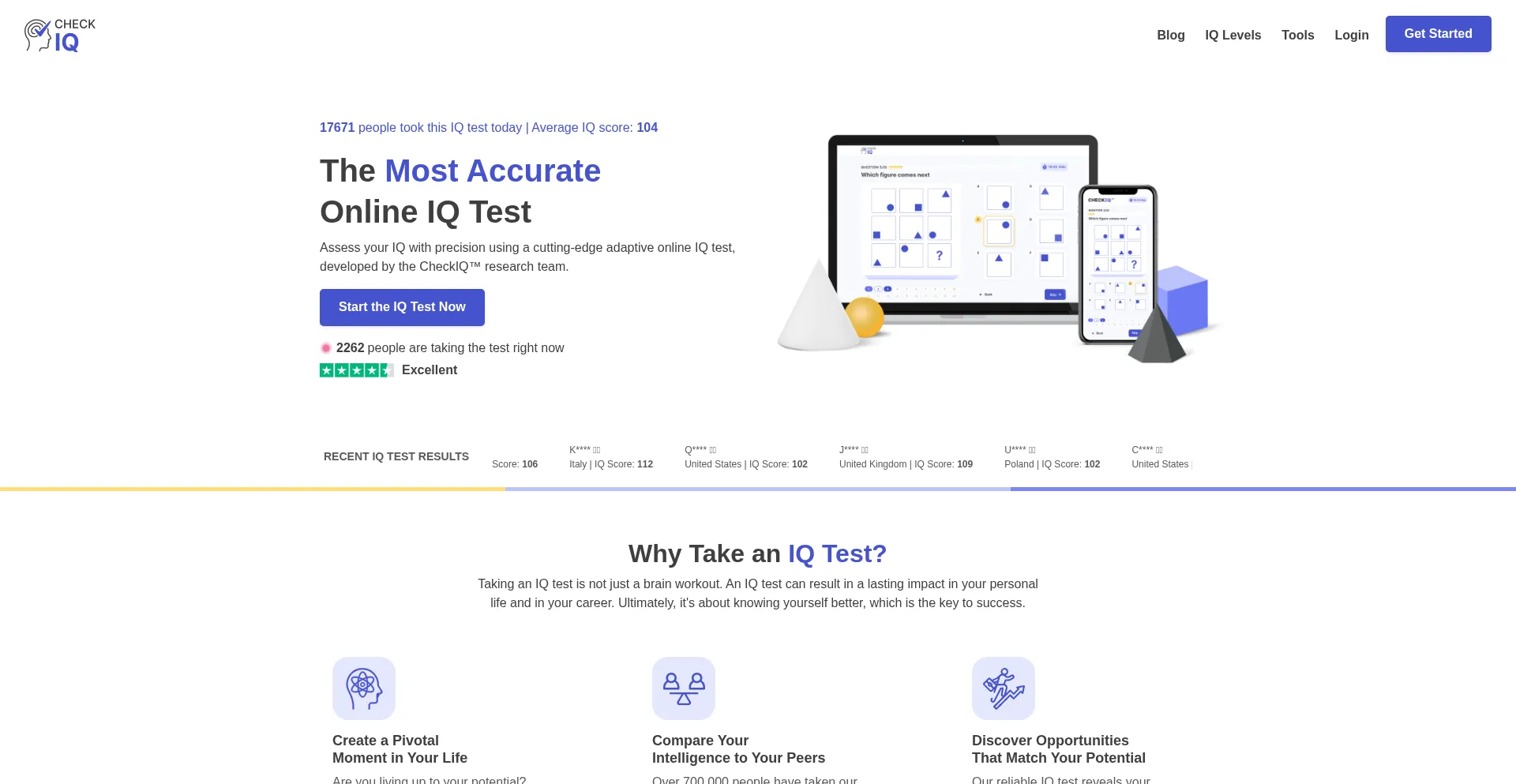 CheckIQ is a reliable online IQ test that automatically adapts to your level for more accurate results. Join over 500k users and get your IQ score in 20 minutes.