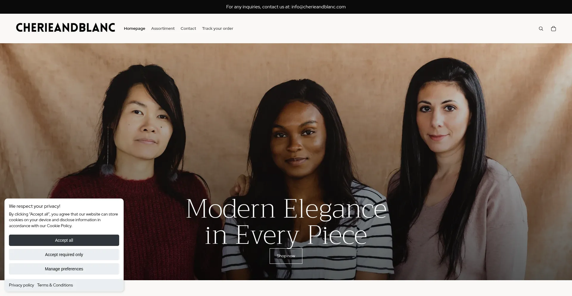 Analysis indicates that cherieandblanc.com operates as an e-commerce platform facilitating online transactions for goods or services. The website implements shopping cart functionality, payment processing systems, and product catalog features typical of commercial retail operations.