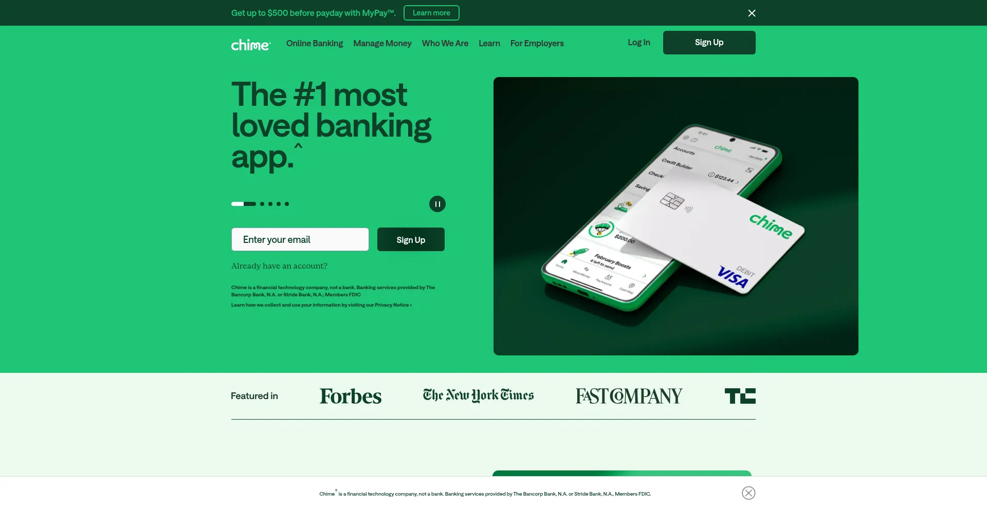 The chime.com website uses Google Tag Manager to add and update tracking tags on its website.