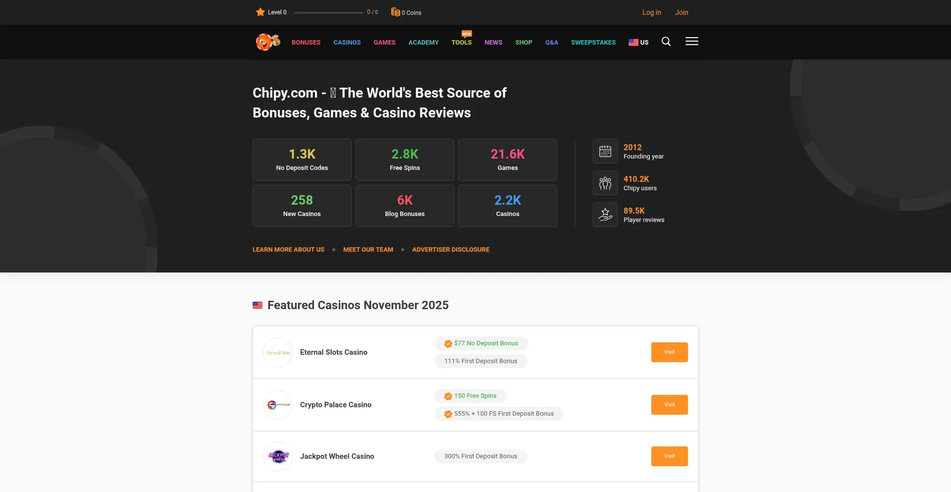 Chipy.com is the World's Biggest and Most Reliable Source of Online Casino Bonus Codes, Reviews & Games! Join a Huge Community of Real Gamblers!