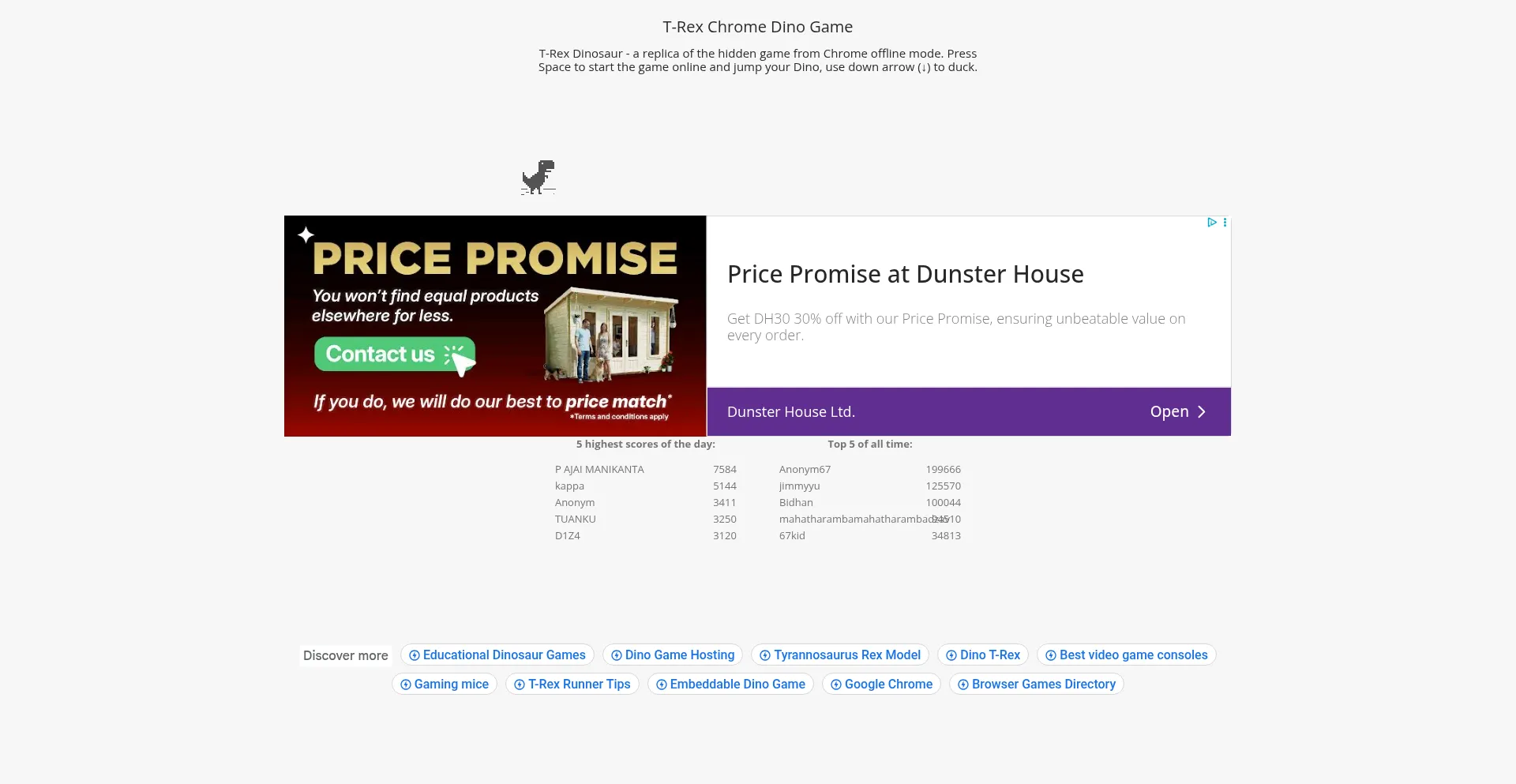 T-Rex Dinosaur Game - Chrome Dino Runner Online