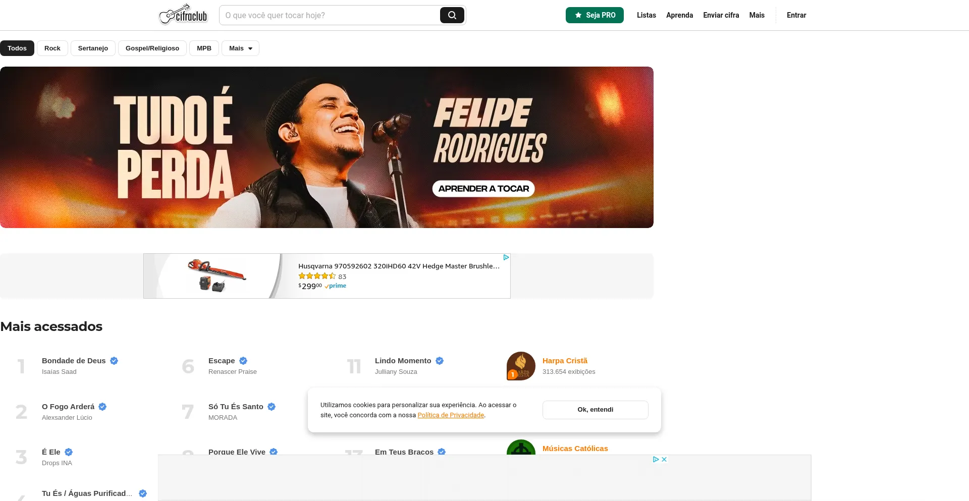 Cifras e tablaturas de músicas para violão, guitarra, baixo, piano, teclado, bateria e gaita. Possui videoaulas e classificados de professores.