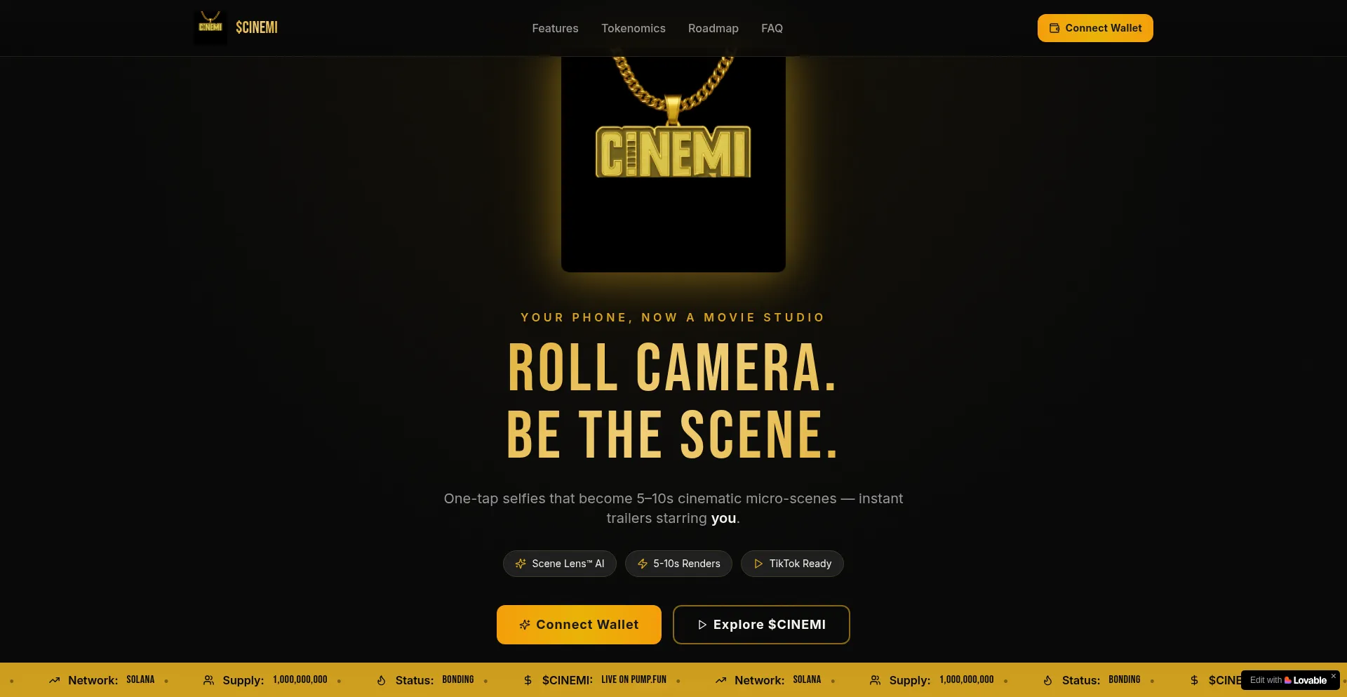 Cinemi ($CINEMI) is the memecoin that powers an AI instant-movie engine. One-tap selfie to 5-10s cinematic scene. Your phone, now a movie studio.