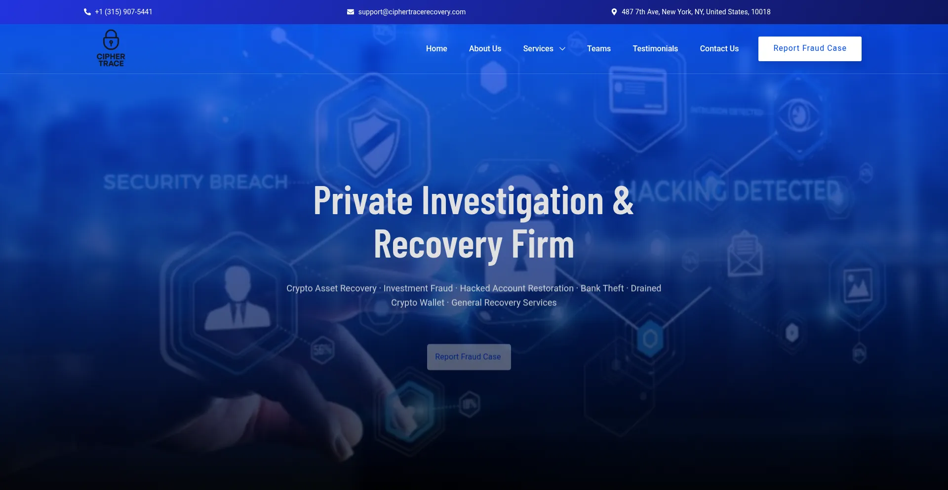 The website ciphertracerecovery.com advertises fund recovery services for lost or stolen assets. While some operate on contingency fee structures, others may require upfront payments, which can indicate fraudulent operations. Verify credentials and regulatory compliance before engaging such services.