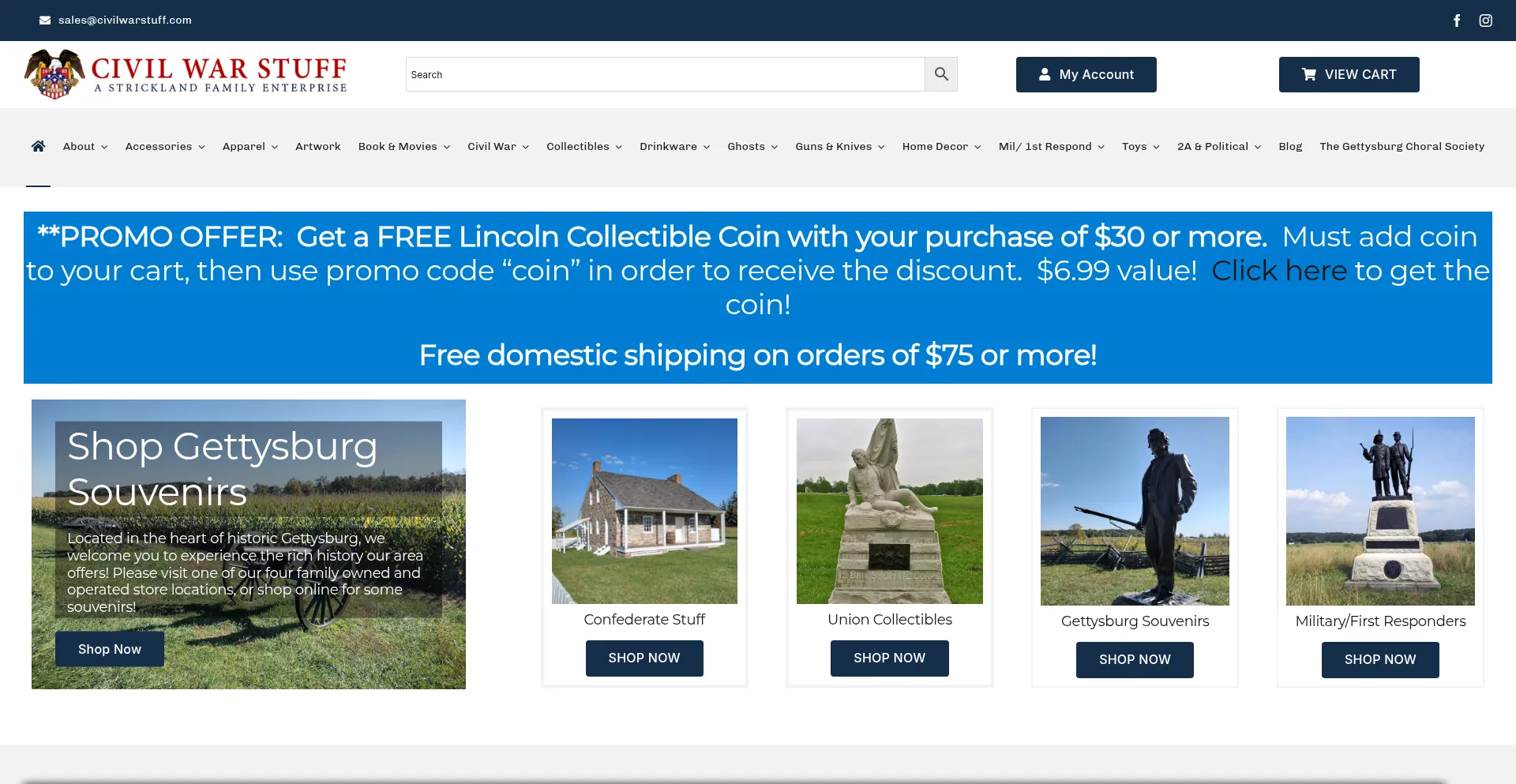 Analysis indicates that civilwarstuff.com operates as an e-commerce platform facilitating online transactions for goods or services. The website implements shopping cart functionality, payment processing systems, and product catalog features typical of commercial retail operations.
