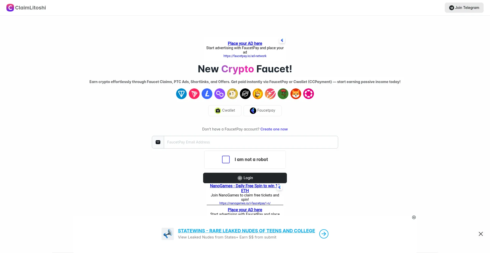 Earn crypto effortlessly through Faucet Claims, PTC Ads, Shortlinks, and Offers. Get paid instantly via FaucetPay or Cwallet (CCPayment) — start earning passive income today!