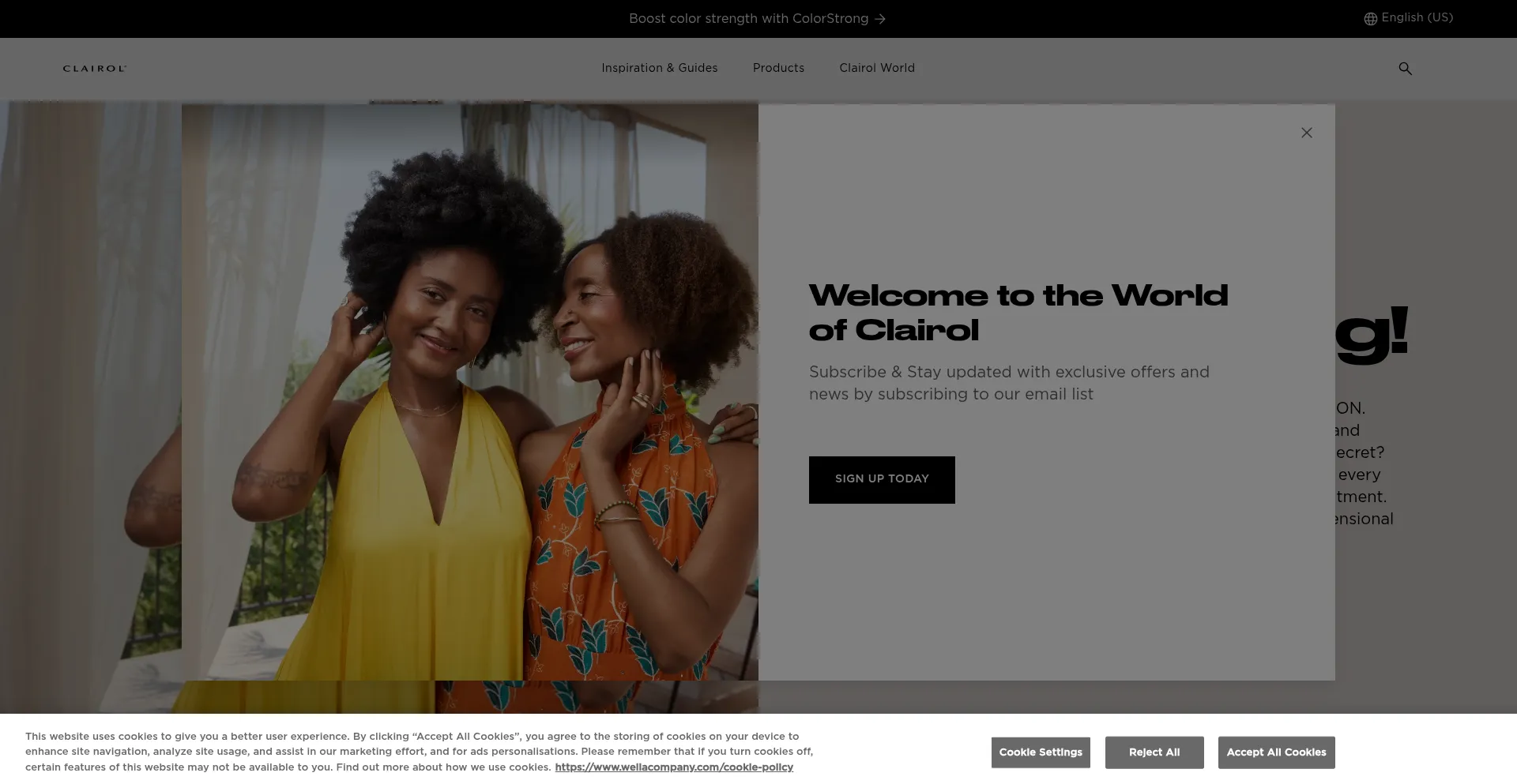 The website implements cookie consent mechanisms in compliance with privacy regulations such as GDPR or CCPA. This demonstrates that clairol.com adheres to data protection standards and provides users with control over personal data collection practices.