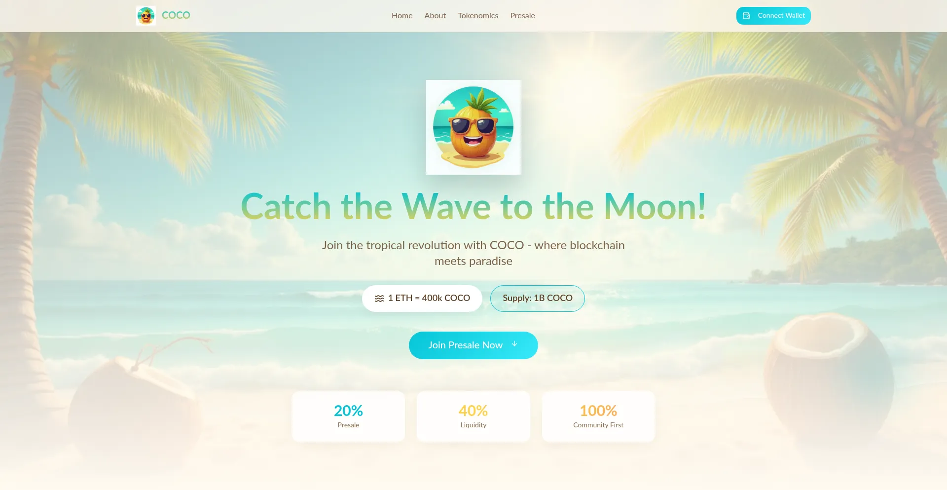 Join the COCO token presale! A tropical meme coin with a community-first approach. 1 ETH = 400,000 COCO. Limited presale - don't miss out!