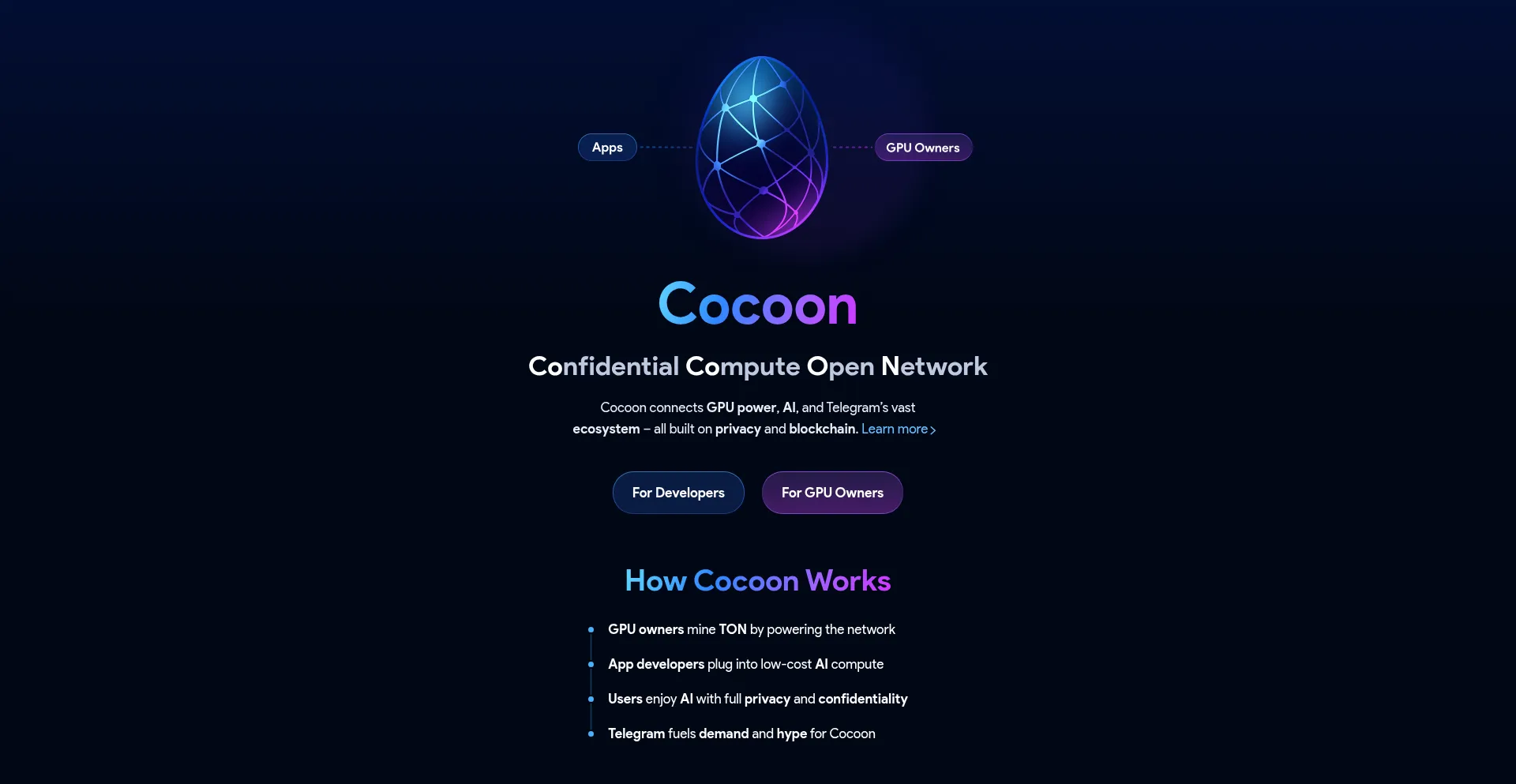 Cocoon connects GPU power, AI, and Telegram’s vast ecosystem – all built on privacy and blockchain.