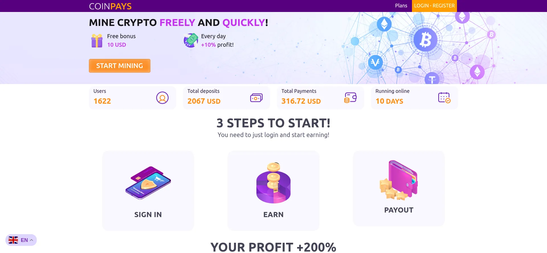 Coin Pays - online mining with real money withdrawal. Free bonus 10 USDT
