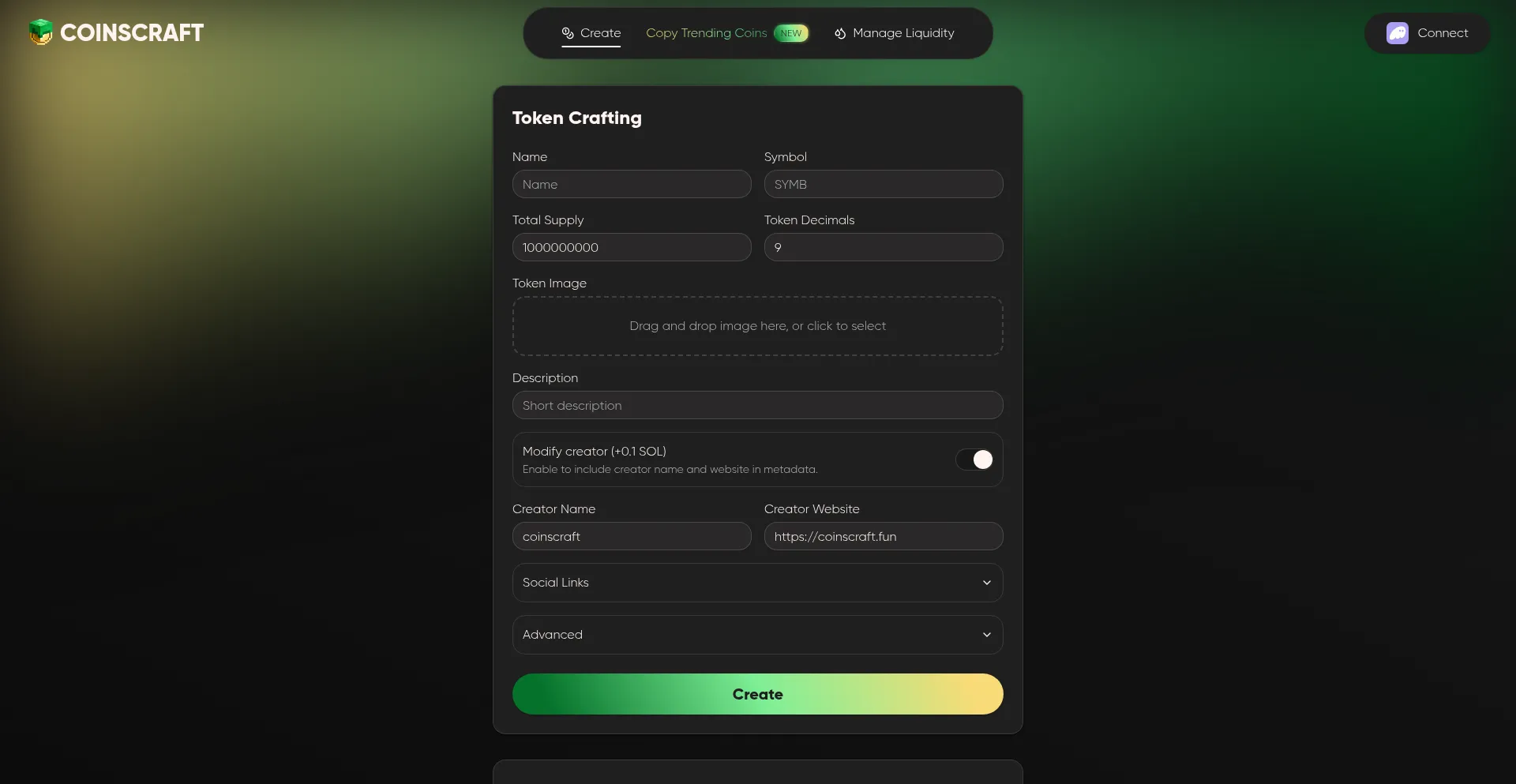 Create and manage Solana SPL tokens instantly with coinscraft. Mint, customize metadata, and launch liquidity pools in a few clicks.
