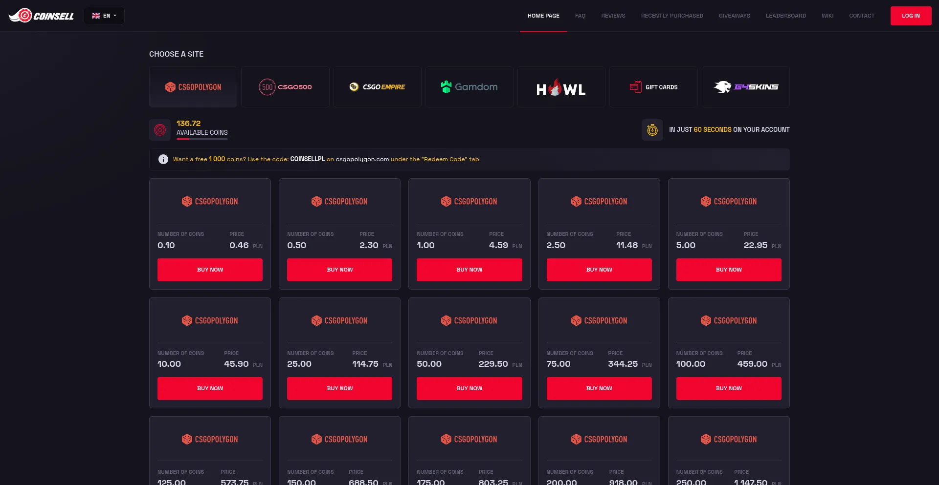 In our store, you can purchase Coins for CSGOPolygon via SMS, PSC, and Bank Transfer. We offer instant coin delivery. Check us out.