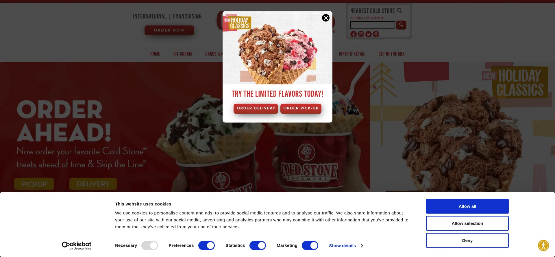 The website implements cookie consent mechanisms in compliance with privacy regulations such as GDPR or CCPA. This demonstrates that coldstonecreamery.com adheres to data protection standards and provides users with control over personal data collection practices.