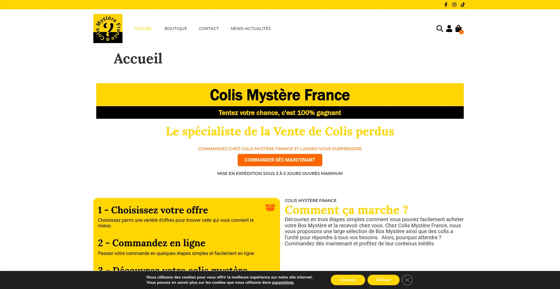 Analysis indicates that colis-mystere-france.com operates as an e-commerce platform facilitating online transactions for goods or services. The website implements shopping cart functionality, payment processing systems, and product catalog features typical of commercial retail operations.