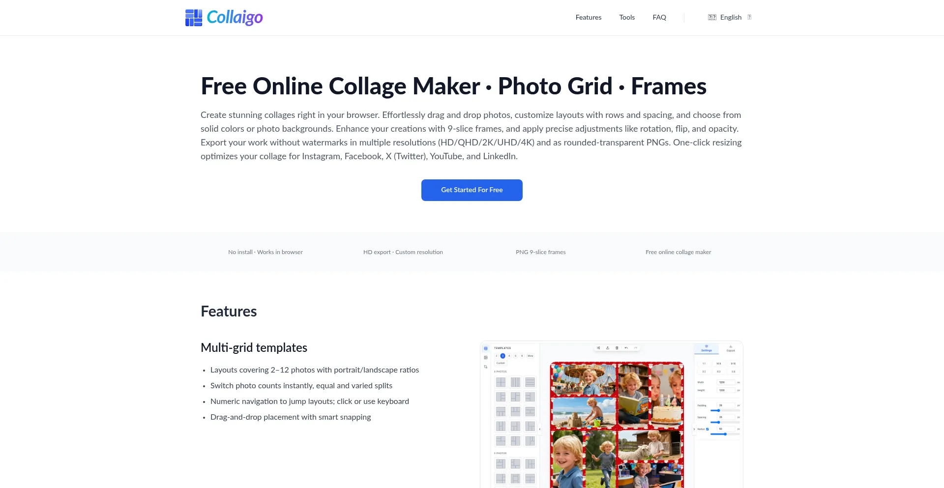Create photo collages online: templates, 9-slice frames, patterned backgrounds, and HD export. No learning curve—works in your browser.
