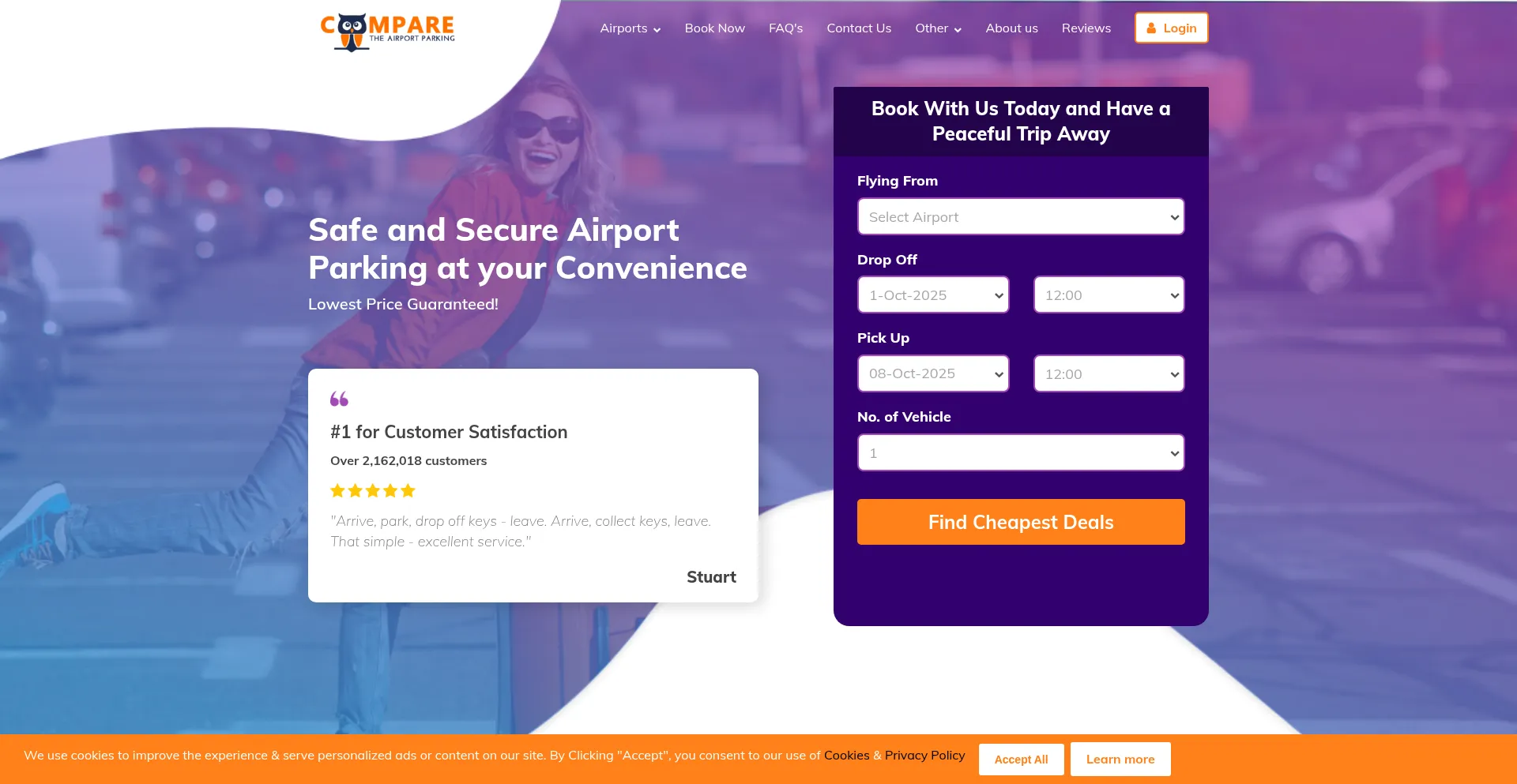 The website implements cookie consent mechanisms in compliance with privacy regulations such as GDPR or CCPA. This demonstrates that comparetheairportparking.com adheres to data protection standards and provides users with control over personal data collection practices.